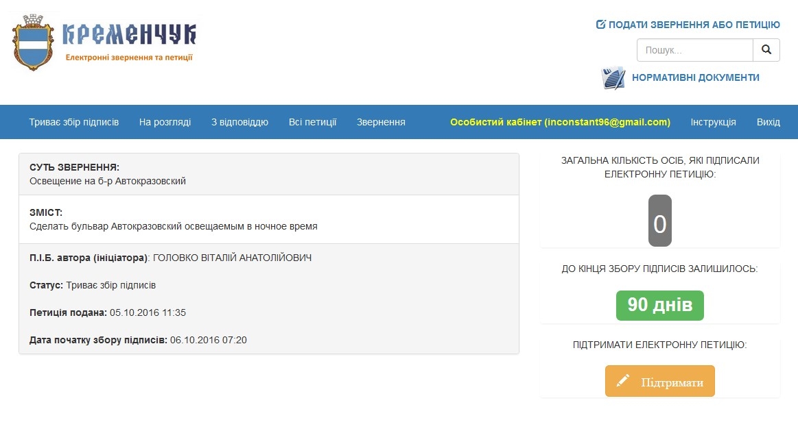 6 жовтня на сервісі електронних петицій меріїї почався збір підписів під двома новими зверненнями до мера Кременчука Віталія Малецького.
