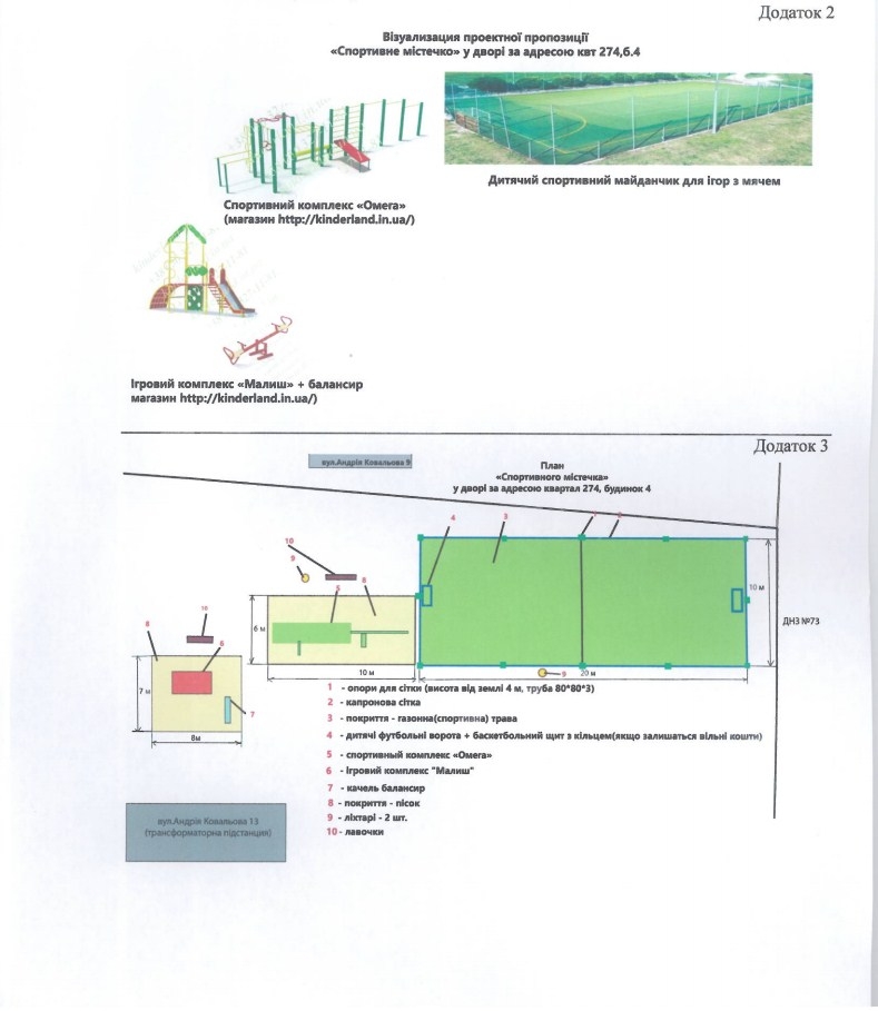 Автор проекта предлагает оборудовать спортивную площадку в квартале 274. По ее задумке, необходимо загородить площадку для спортивных игр, засеять травой, установить спортивный комплекс, провести освещение.