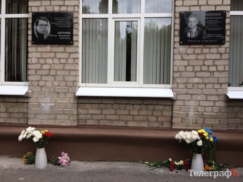 11 октября на фасаде Кременчугской специализированной школы I-III ступеней №10 с углубленным изучением английского языка установили мемориальные доски погибшему в АТО бойцу Артему Носенко и писателю Виктору Баранову.