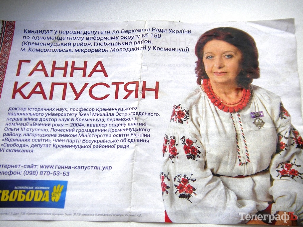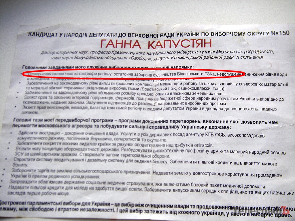 Осталось напомнить, что именно Капустян в 2010-м сообщила кременчугской прессе о готовящемся строительстве БГОКа и начала компанию по борьбе с ним. Свою избирательную компанию депутат Капустян строила именно на декларировании борьбы против строительства БГОКа, этот пункт стоит первым в её агитационной листовке (смотри ниже). Возможно, именно такое явное несоответствие обещаний и реальности возмутило жителей района, приехавших на сессию райсовета.