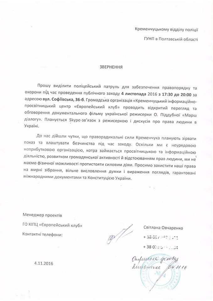 4 ноября, вечером в «Просторі Ідей» (подвальное помещение здания на ул. Софиевской) должен был проходить показ фильма под названием «Марш Равности». Кратко говоря - он о геях и тех, кто выступает против их маршей. Режиссер фильма – журналист из Киева Оксана Пиддубная. В ленте присутствует и точка зрения людей с нетрадиционной ориентацией и тех, кто считает, что это неподобающе.