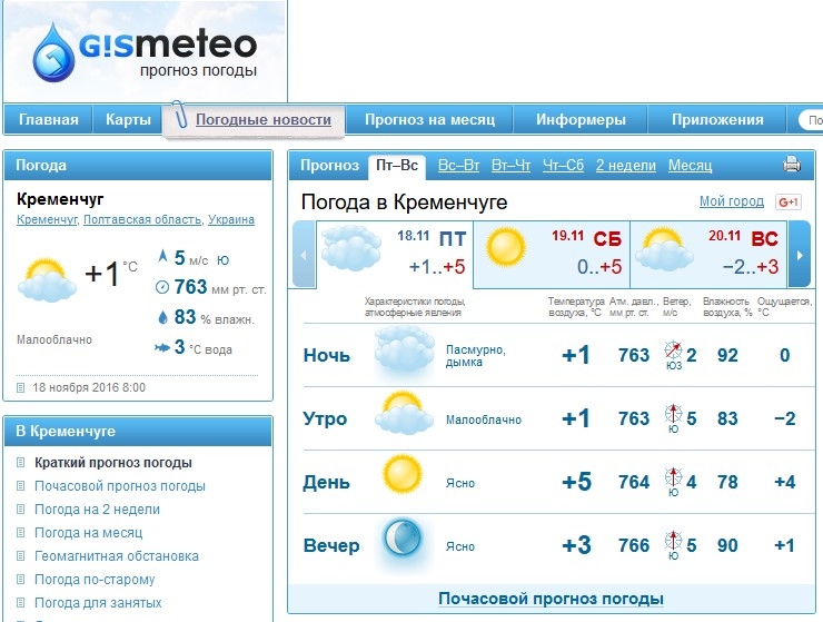 Sinoptik пише, що до вечора 18 листопада небо проясніє: «Хмар, які покривають небо у Кременчуці вранці, після полудня не буде, і до самого вечора вони вже не з'являться. Без опадів». Температура повітря триматиметься від +1ºС до +5ºС.