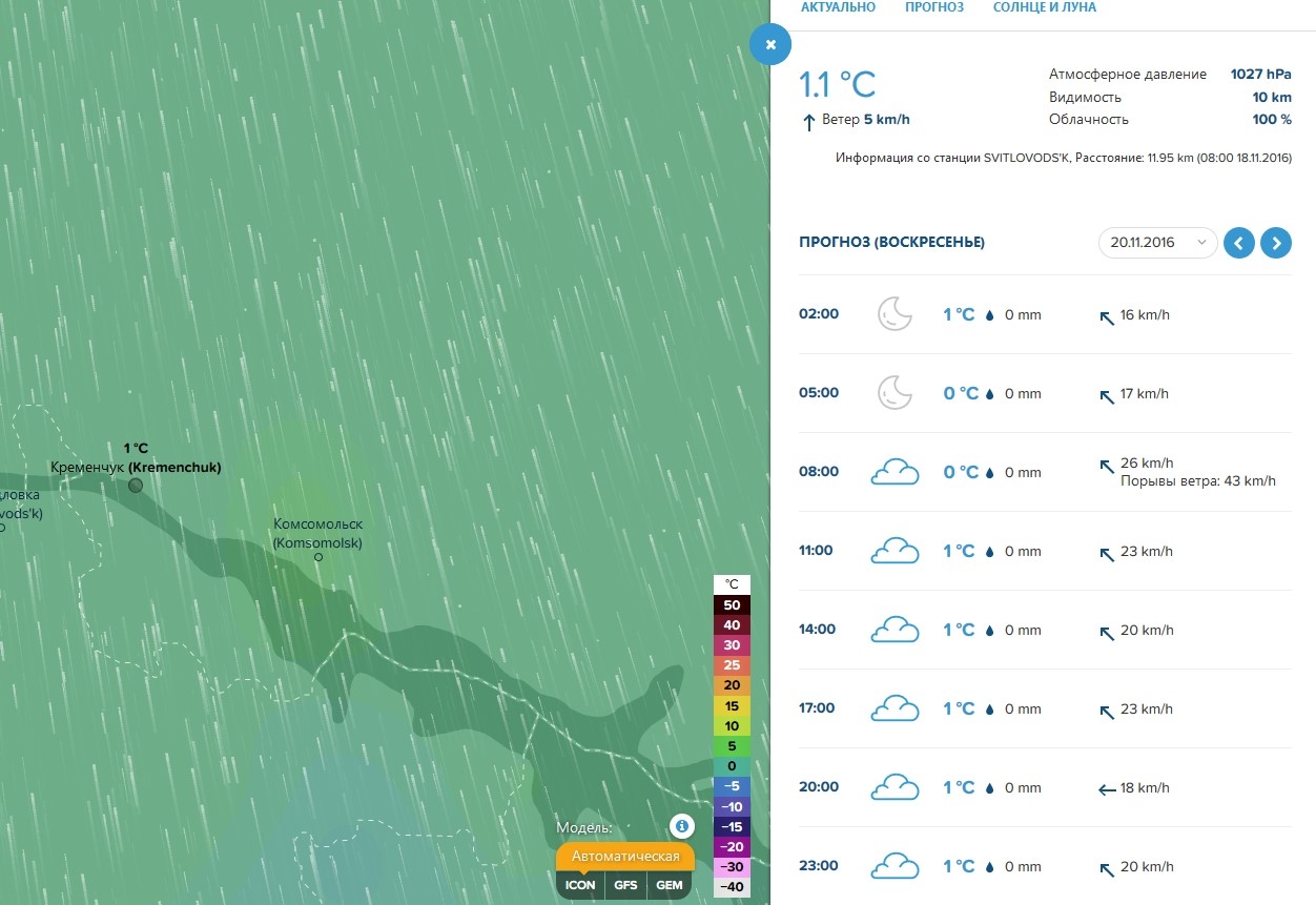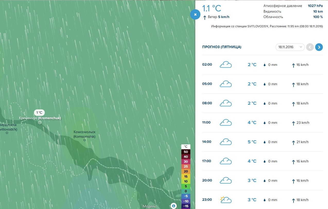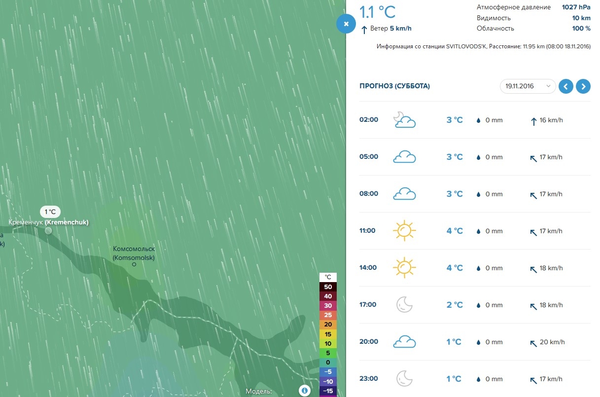 rp5 дає м'якший прогноз - на вікенд температура не впаде нижче +1ºС, але вже ранком понеділка, 21 листопада, у Кременчуці можливий невеликий сніг.