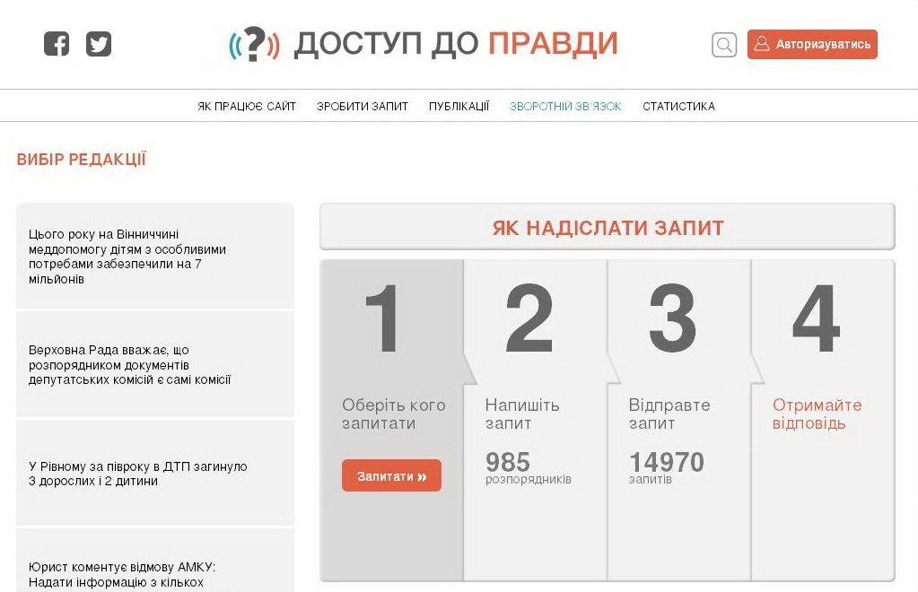 Проект «Доступ до правди» було започатковано у 2014 році. В рамках проекту було створено однойменний онлайн ресурс, який дозволяє громадянам відправляти запити на публічну інформацію. З моменту створення, за допомогою сайту Доступ до правди було надіслано більше 15 500 запитів на публічну інформацію. На даний момент сайт є найбільшою в Україні базою розпорядників публічної інформації