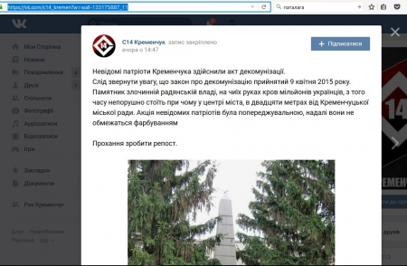 В социальной сети vk.com в группе «С14 Кременчук» 27 ноября появилась запись о том, что «неизвестные патриоты Кременчуга совершили акт декоммунизации». Сообщение появилось до того, как информация об акте вандализма попала в средства массовой информации. В описании группы С14 (Січ) говорится, что это молодёжная организация, которая исповедует украинский национализм и объединяет в себе разноплановых активистов и патриотов.
