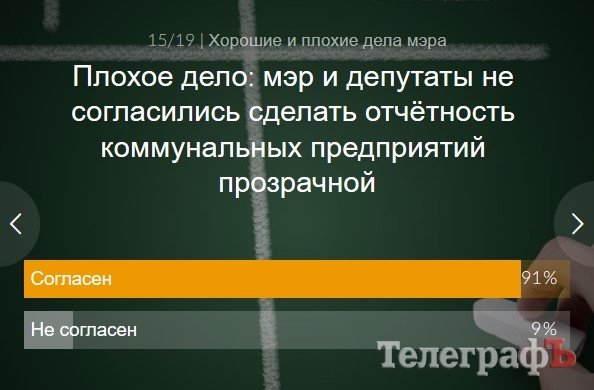 Мы были удивлены №1 в списке «плохих дел» – «мэр и депутаты не согласились сделать отчётность коммунальных предприятий прозрачной». Просто удивительно осознавать, что это главная проблема в городе. Но, с другой стороны, открытость – это один из элементов успешного проведения реформ. Будем думать, что читатели заинтересованы, в первую очередь, в решении системных проблем.