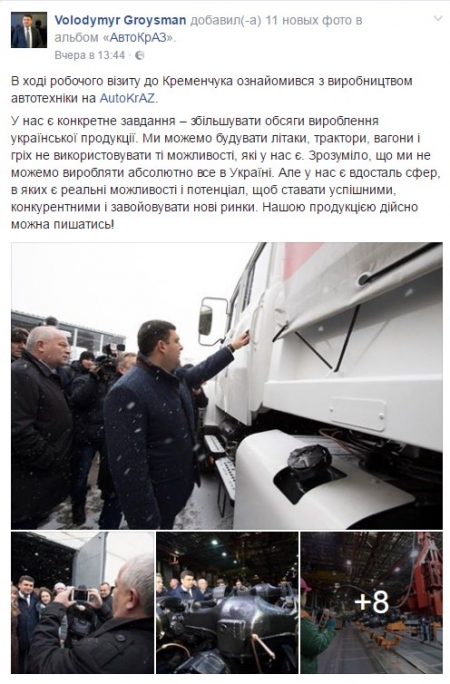 У нас есть конкретная задача - увеличивать объемы выработки украинской продукции. Мы можем строить самолеты, тракторы, вагоны и грех не использовать те возможности, которые у нас есть. Понятно, что мы не можем производить абсолютно все в Украине. Но у нас есть достаточно сфер, в которых есть реальные возможности и потенциал, чтобы становиться успешными, конкурентными и завоевывать новые рынки. Нашей продукцией действительно можно гордиться!, - пост Владимира Гройсмана о КрАЗе.