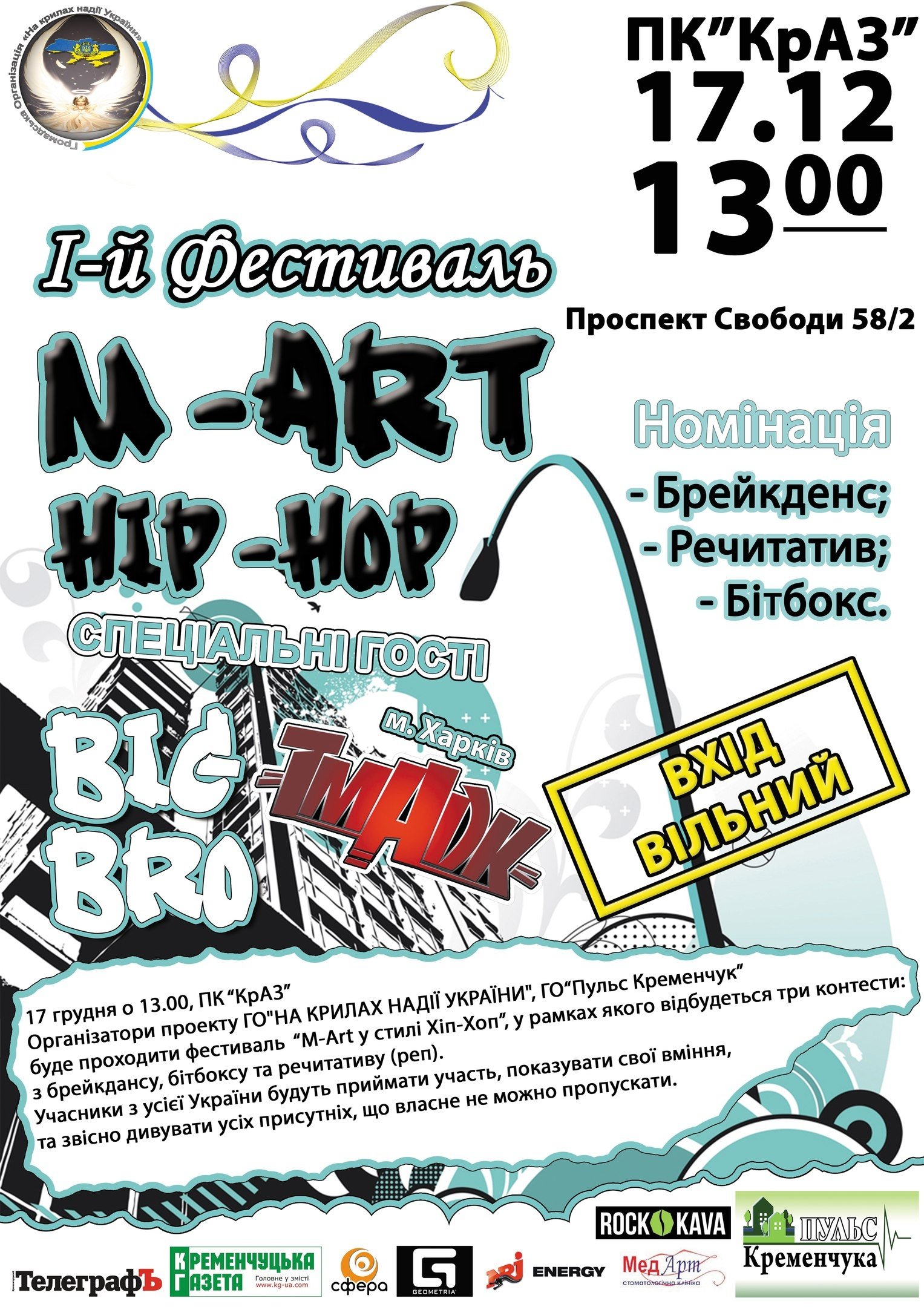 17 декабря в Кременчуге состоится фестиваль хип-хоп культуры M-Art, в рамках которого будут демонстрировать свои умения мастера и любители брейкданса, битбокса и рэпа.