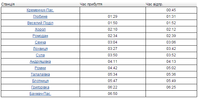 Кременчуг - Бахмач. Отправление в 00:45, прибытие в 6:50. Время в пути - 6 часов 5 минут