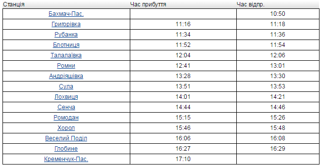 Бахмач - Кременчуг. Отправление в 10:50, прибытие в 17:10. Время в пути - 6 часов 20 минут