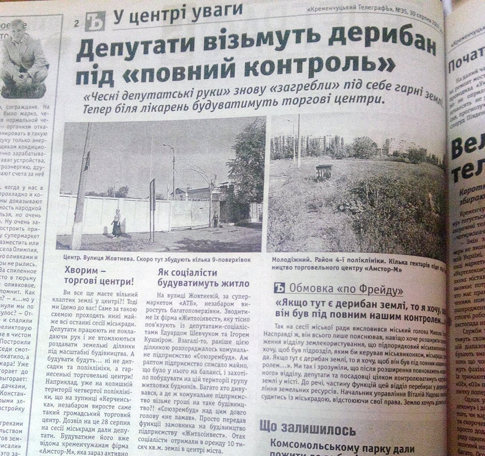 Победил «Житлоинвест». Журналисты тогда возмущались – почему землю компании отдали в аренду, а не продали? Ведь арендная ставка на период строительства составляет всего 1% от денежной оценки земли, городской бюджет терял такие суммы! Тогда «ТелеграфЪ» написал: «То чому ж депутати позбавили кременчужан грошей за землю, яка їм належить? На нашу думку, це сталося ось чому. Впливовість фірми «Житлоінвест» базується на трьох китах. Їхні прізвища: пан Кушнір, пан Шевчук та пан Бабаєв. Пан Шевчук – депутат кременчуцької міської ради. Пан Кушнір – депутат кременчуцької міської ради. Пан Бабаєв – народний депутат України. Отже, пани депутати самі собі і віддали ділянку».