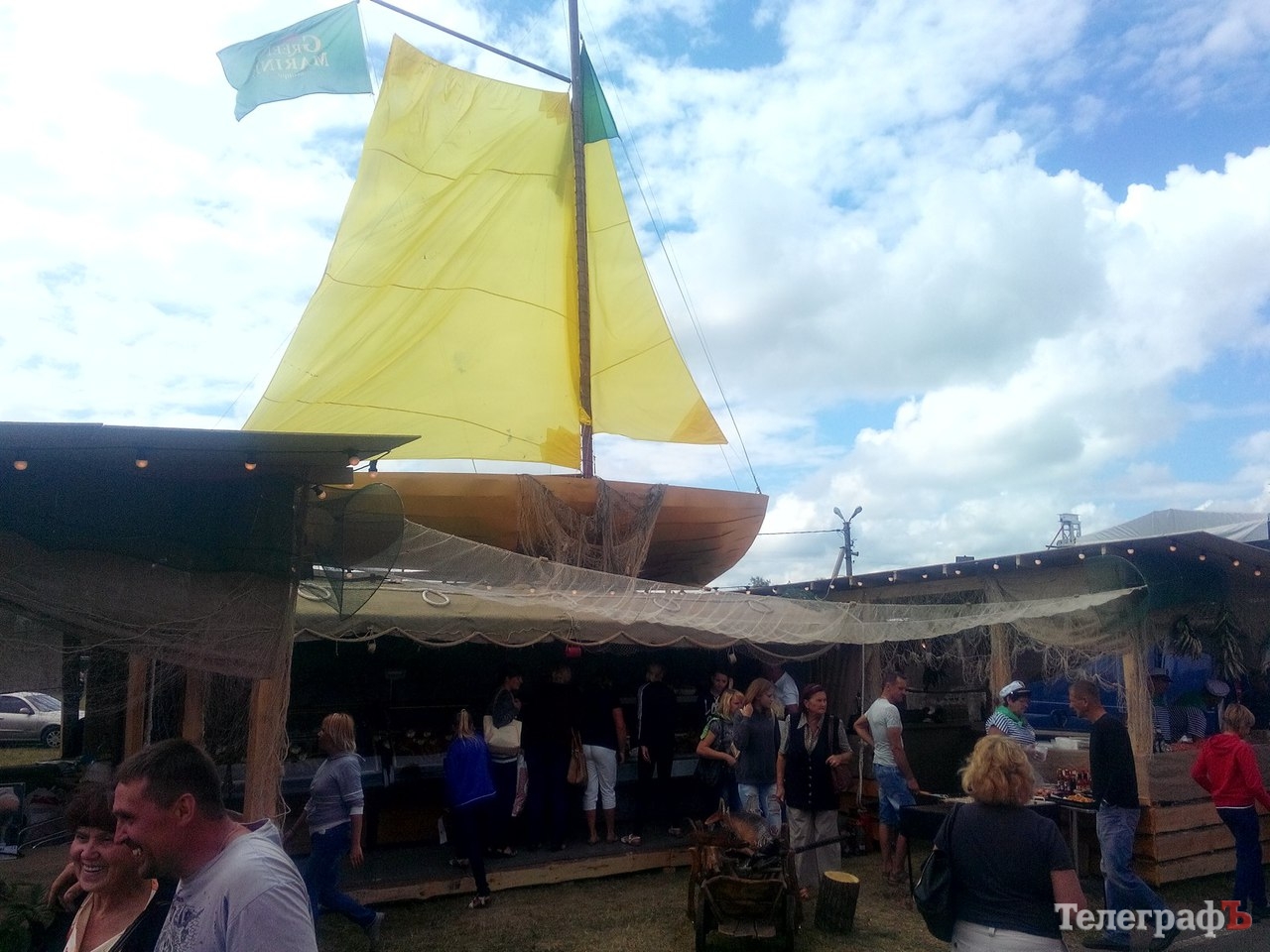 Одесское предприятие, занимающееся переработкой рыбы, украсило свой павильон кораблем. Его мачта 8 метров, парус настоящий. Делали специально для Сорочинцев.
