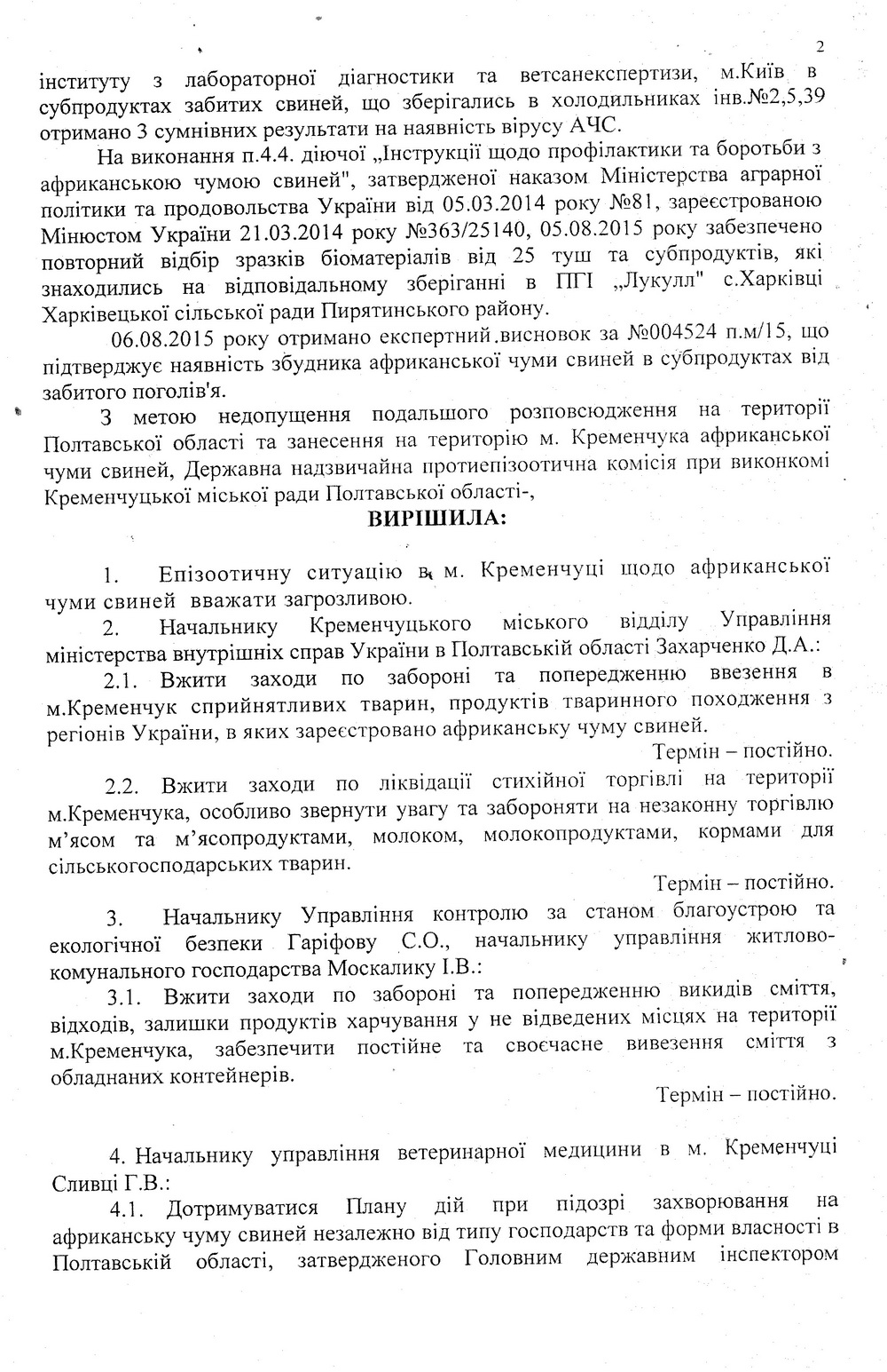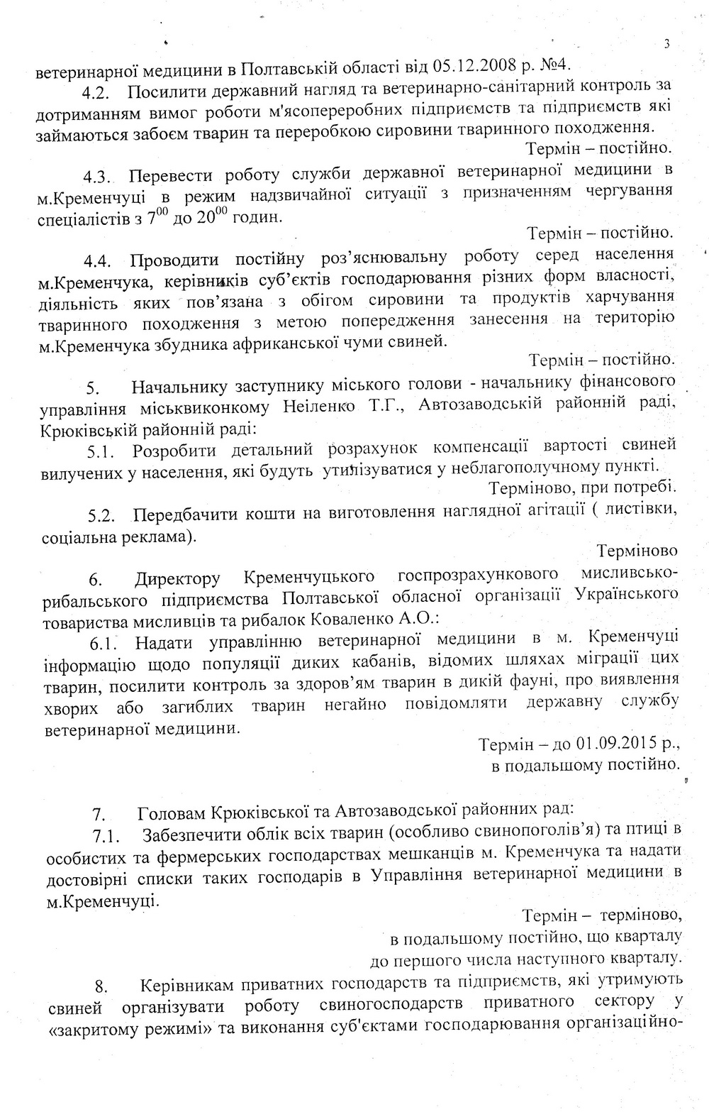 Комісія прийняла низку заходів для протидії африканській чумі, серед яких ліквідація стихійної торгівлі, а адміністрацій районів перерахувати кременчуцьких свиней.