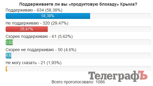 Большинство читателей «Телеграфа» поддерживают «продовольственную блокаду» Крыма. Об этом свидетельствуют результаты двухдневного голосования, которое проводилось на нашем сайте telegraf.in.ua, а также в нашей группе в vk.com.