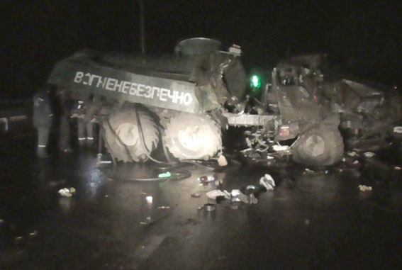 За даними МВС, водій автомобіля Урал з цистерною, який рухався у напрямку Києва, допустив зіткнення з тягачем Рено Магнум з цистерною, який стояв на узбіччі. Унаслідок зіткнення 43-річний водій Урала (сержант збройних сил України) загинув на місці, а його 44-річний пасажир (рядовий ЗС України) – отримав тілесні ушкодження різного ступеню тяжкості. 28-річний водій вантажівки Рено Магнум не постраждав.
