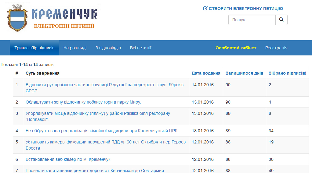 Как ранее сообщал «ТелеграфЪ», возможность отправлять электронные петиции городским властям у кременчужан появилась с 5 января. В первых петициях люди требовали чистоты, светофора у Sport Life и контроля за ценами в больничных аптеках.