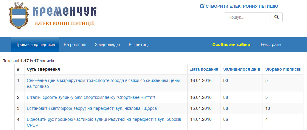 Як раніше повідомляв ТелеграфЪ, можливість писати електронні петиціі меру зявилась у містян 5 січня. Відтоді на сайті 17 петицій.