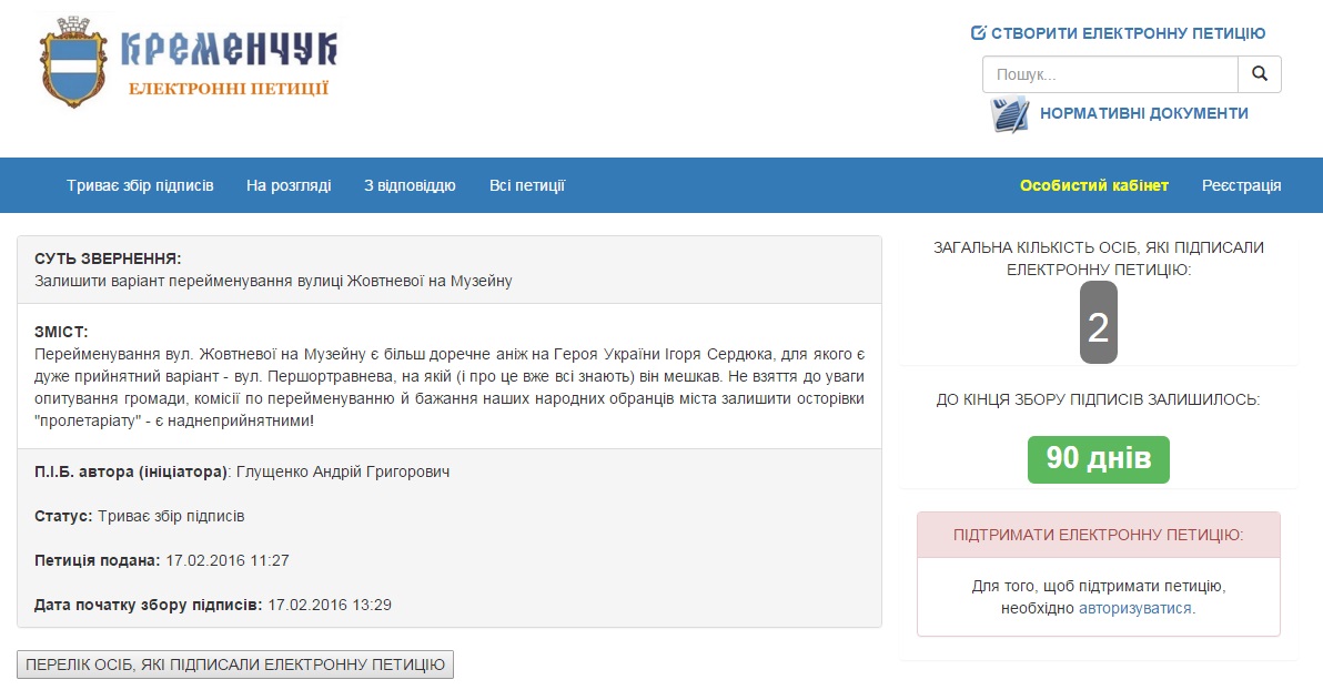 На сайте горисполкома 17 февраля в 11.27 появилась новая петиция мэру Кременчуга Виталию Малецкому. Автор петиции Андрей Глущенко пишет, что переименование улицы Октябрьской на Музейную более уместно, чем на улицу Героя Украины Игоря Сердюка, для которого "есть очень приемлемый вариант - ул. Первомайская, на которой он проживал".