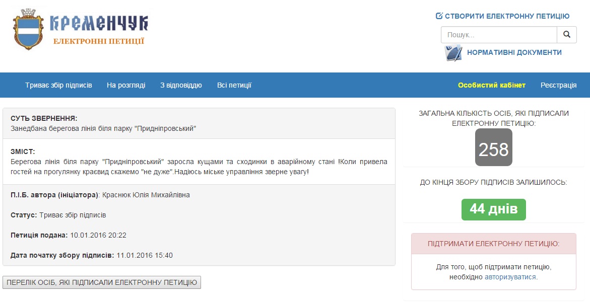 Петиция о запущеной береговой линии возле парка "Приднепровский" набрала 258 голосов (необходимо 250). Этого достаточно для ее рассмотрения мэром Виталием Малецким.