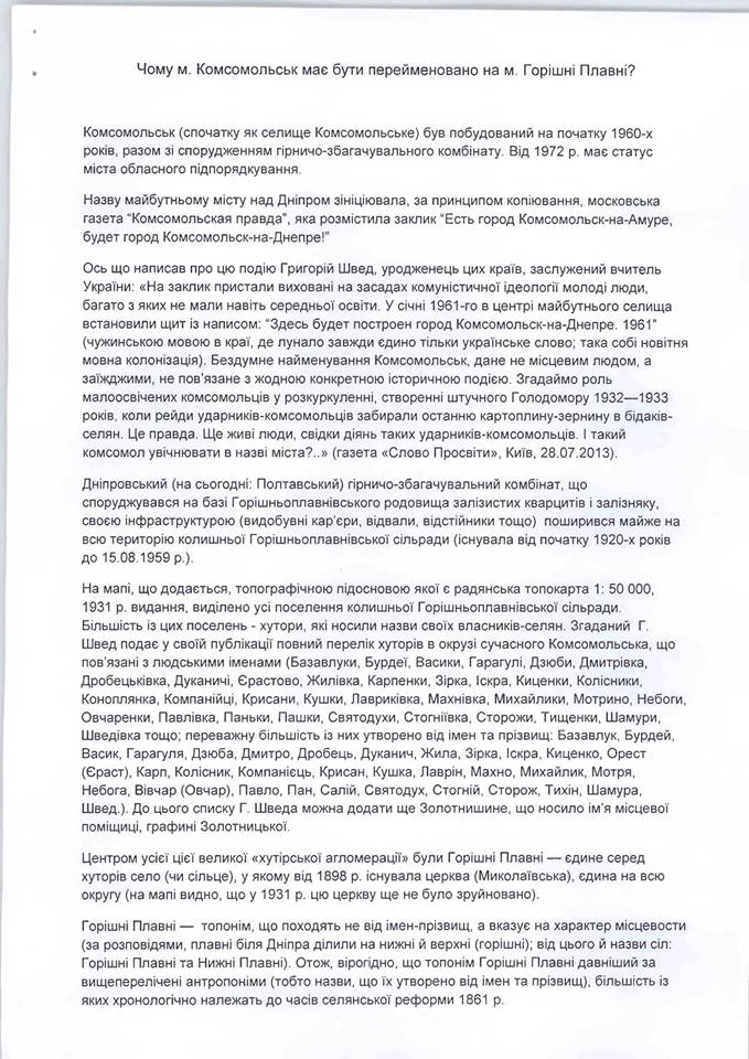 «Запропонована нова назва міста «Горішні Плавні» не має ніякого відношення до нашого міста і місця, де розкинувся Комсомольськ, це не історична назва міста», - йдеться в його заяві.