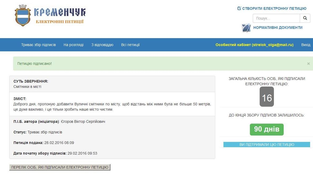 На сайте Кременчугского исполкома также появилась петиция с предложением разместить в городе уличные мусорные урны. Автор этой петиции — Виктор Егоров — предложил разместить урны на расстоянии 50 метров друг от друга.