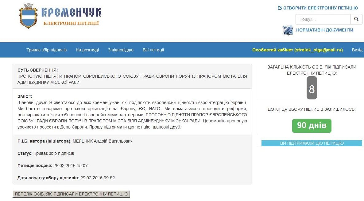 В тексте петиции, за которую уже проголосовало 8 человек, речь идет о предложении поднять флаг Европейского союза и Рады Европы рядом с флагом Кременчуга.