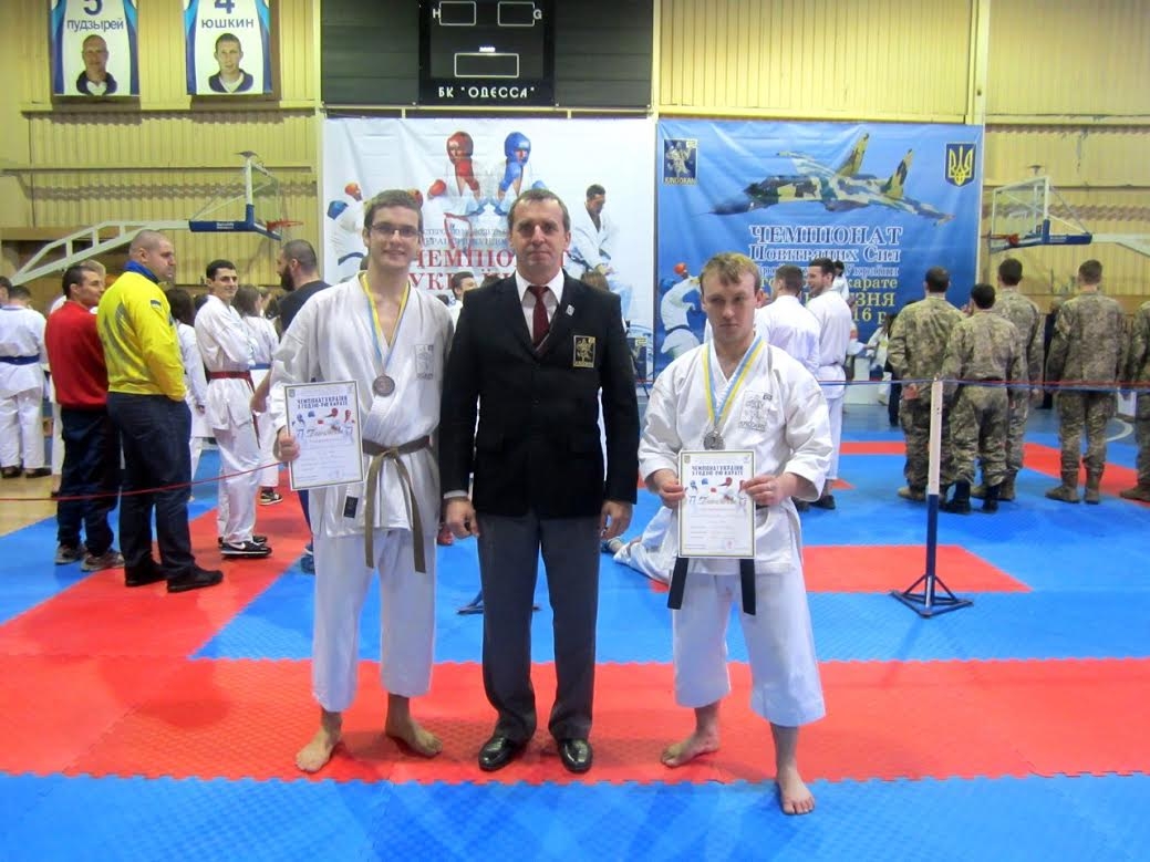 На фото (зліва на право): Андрій Гордієнко (3 місце у разділі ката кобудо), тренер Сергій Калініченко, Дмитро Тараненко (2 місце у розділі ката кобудо)