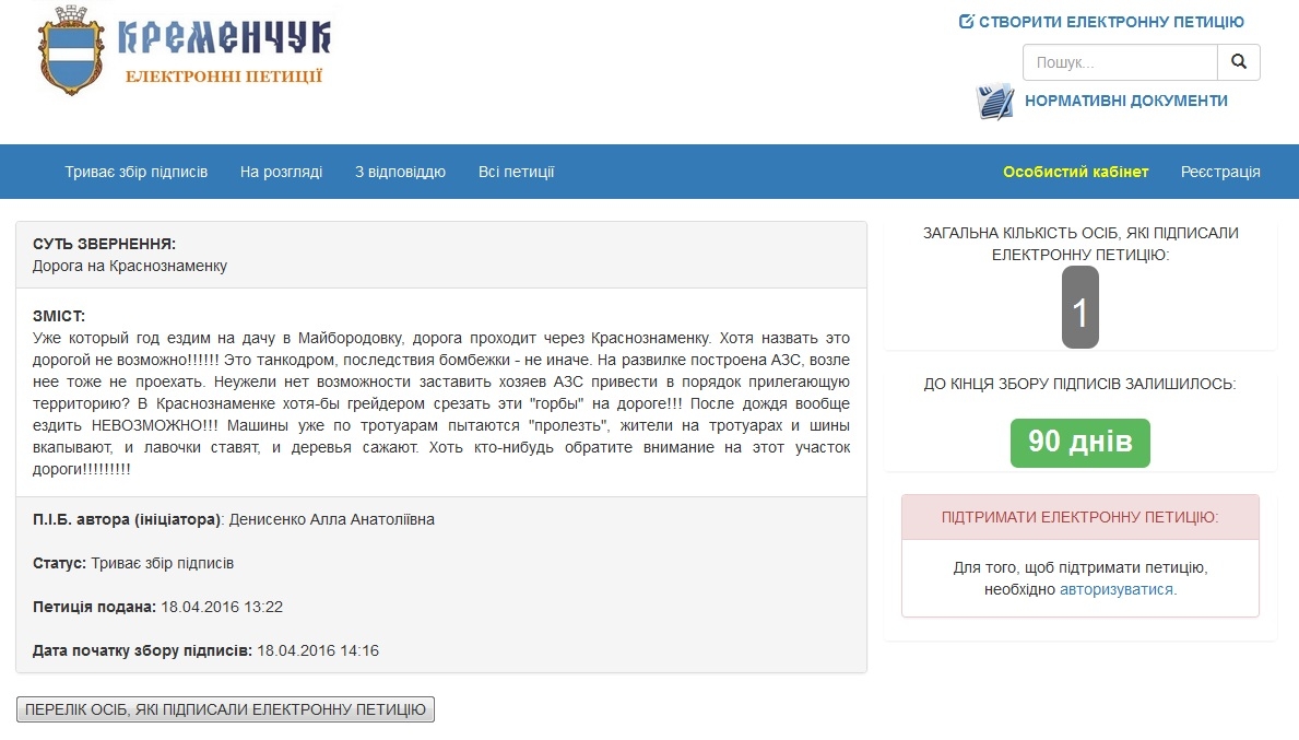 Стоит отметить, что, так как дорога на Краснознаменку не находиться на территории Кременчуга, городской голова никак не может повлиять на её состояние, но Вы всё равно можете поддержать эту петицию - здесь.