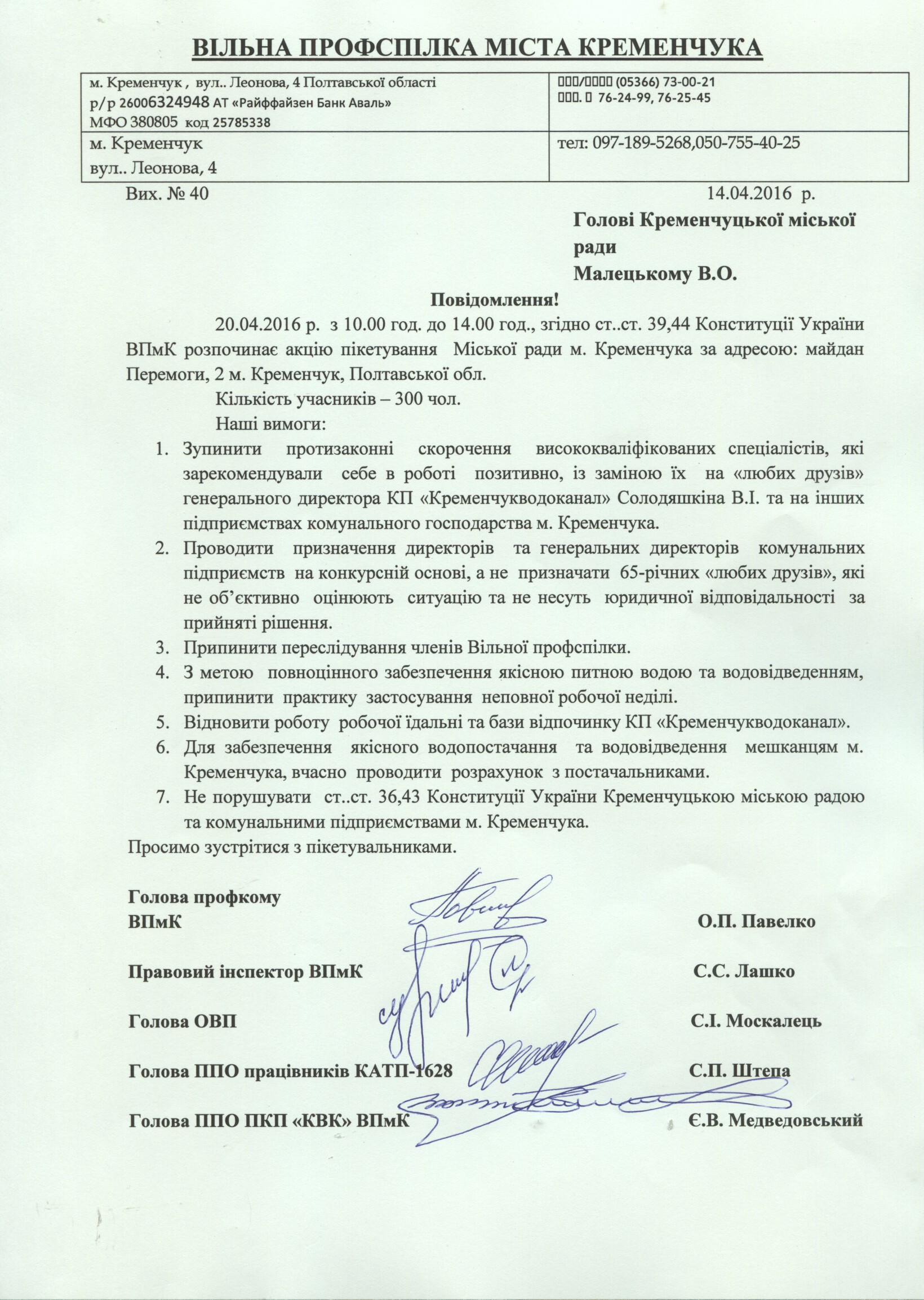 19 апреля с 10.00 до 14.00 члены Вольного профсоюза планируют устроить пикет перед мэрией Кременчуга на площади Победы. Они хотят пообщаться с мэром Виталием Малецким на тему увольнения членов их организации с коммунальных предприятий – «Кременчугводоканала», «Благоустройства Кременчуга», и «КАТП-1628».
