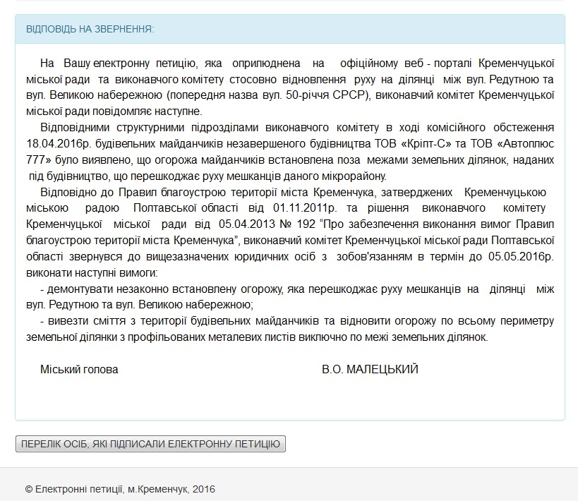 Кременчужане поддержали его обращение и 9 апреля эта петиция набрала необходимые для рассмотрения 250 голосов.