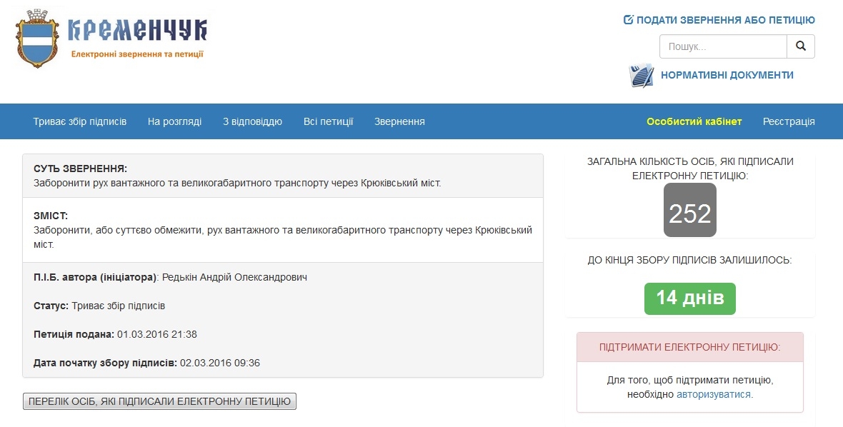 17 марта петиция о запрете движения грузового и крупногабаритного транспорта через Крюковский мост набрала необходимое для её рассмотрения городским головой Кременчуга Виталием Малецким количество голосов.