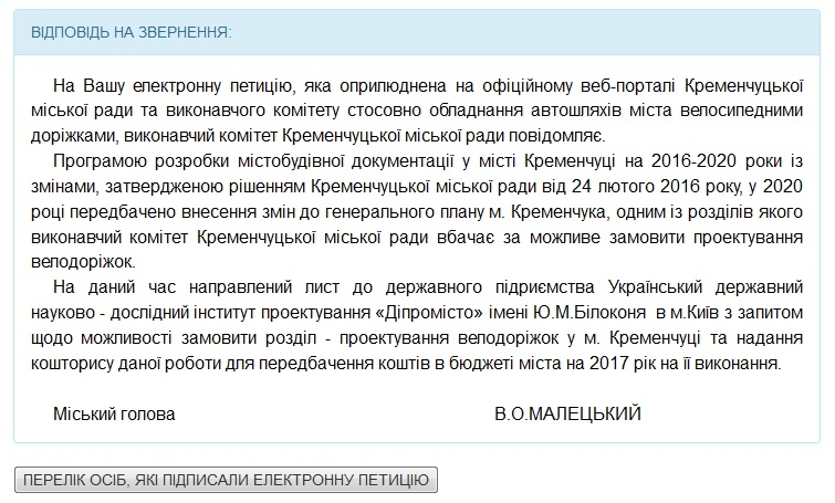 У своїй відповіді Малецький повідомив, що на даний час до державного підриємства Український державний науково - дослідний інститут проектування «Діпромісто» імені Ю.М.Білоконя в Києві направлений лист із запитом щодо можливості замовити проект велодоріжок у Кременчуці та надання кошторису даної роботи для передбачення коштів в бюджеті міста на 2017 рік.
