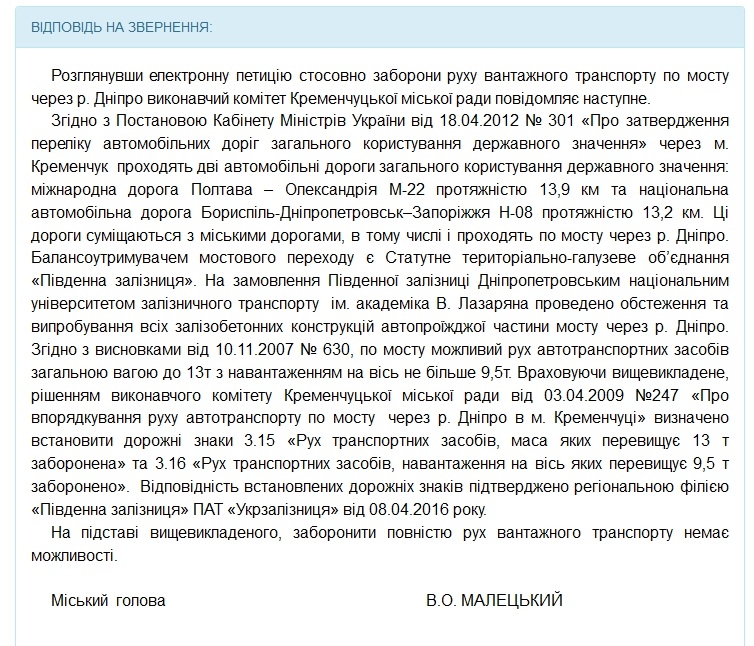 27 мая мэр Кременчуга Виталий Малецкий ответил на петицию о запрете движения грузового и крупногабаритного транспорта через Крюковский мост.