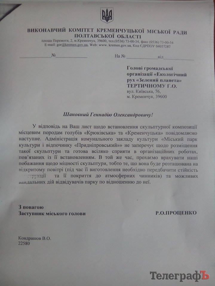 Мэрия разрешила кременчугским голубеводам установить в Приднепровском парке скульптурную композицию местным породам голубей - "Крюковской" и "Кременчугской". Об этом "Телеграфу" сообщил Геннадий Тертычный, глава оргкомитета общественной организации экодвижение «Зеленая планета» (клуб Голубеводов).