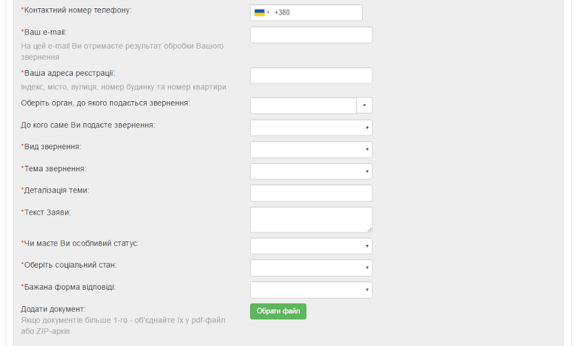 Когда вы прошли этот шаг, то увидите свои данные (фамилия, имя, отчество). Теперь можете заполнить форму для своего обращения. она включает в себя телефон, электронную почту (на этот e-mail получите результат обработки обращения), адрес регистрации. Далее у вас нужно выбрать орган, в который подается обращение ( «Полтавская ОГА») и к кому именно оно адресуется ( «Председатель Полтавской ОГА »). В поле «Вид обращения» можно выбрать заявление (ходатайство), предложение или жалобу. Также стоит заполнить тему обращения, детализировать ее и написать сам текст заявления. Если есть какой-то файл, который касается вашего обращения, то можете его прикрепить к форме.