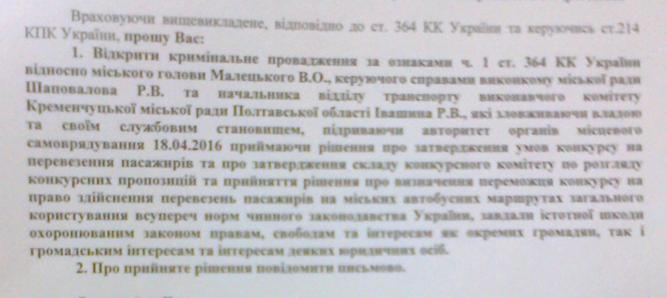 Депутаты Кременчугского госсовета Александр Кальченко и Оксана Пиддубна, а также гражданин Олег Бублик подали в полицию заявление на мэра Кременчуга Виталия Малецкого, управляющего делами исполкома Руслана Шаповалова, а также начальника отдела транспорта Руслана Ивашину. Они требуют открыть уголовное производство по ч. 1 ст. 364 УК Украины (злоупотребление властью или служебным положением).