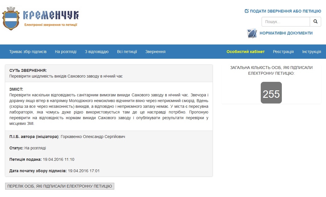 30 червня петицію з вимогою перевірити шкідливість викидів сажового заводу (Кременчуцького заводу технічного вуглецю) в нічний час підтримав 250-й кременчужанин. Цього достатньо для її розгляду міським головою.