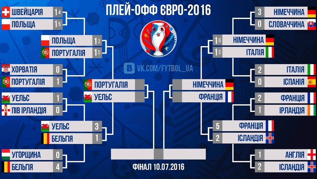 Кінець казки "крижаного острова". Франція – Ісландія 5:2 (4:0). Після гри з Англією ісландці стали чи не найулюбленішою командою уболівальників у Франції. Хлопці з Ісландії заслужили повагу своєю відданою грою і бійцівським характером. Такої ж гри ми всі очікували й у двобої Франція - Ісландія. Вікінги з острова надії виправдали. Вони билися з першої хвилини й до останньої. А забивала в першому таймі лише Франція. У ворота ісландців залітало майже все, що створювали французи. Збірна Ісландії не зупинялась і тероризувала Францію. На 56 хвилині Сігтороссон зіграв на випередження після передачі з флангу і відквитав один гол. Попри ще один пропущений, ісландці продовжували бігти вперед, пресингували й забили. Під кінець матчу Бьярнасон ударом головою забив м’яч.