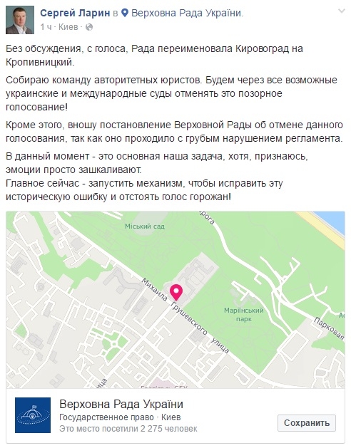 Тем временем депутат от Кировоградщины Сергей Ларин уже собирает в Фейсбуке команду юристов, чтобы отметинь "это позорное голосование". Сам С.Ларин за этот вопрос не голосовал.