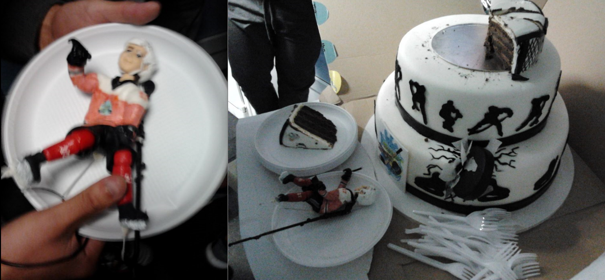 Після коментарів вболівальники довго не відпускали капітана у роздягальню, де його чекав тортик з символічною фігуркою хокеїста з номером 22.