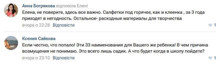 В кременчугских детсадах прибыло пополнение, и новопришедшие родители столкнулись с практикой получения перечней необходимых к покупке товаров – как канцтоваров, так и моющих средств. Естественно, многих родителей такая практика удивляет, и они возмущаются. В группе «Кременчугского Телеграфа» в vk.com развязалась дискуссия на тему: а зачем, а надо ли, а не дорого ли? Большинство высказавшихся из тех, кто детей в сад водит не первый год, считают, что покупка вещей из «списков» необходима, и они предназначены для детей. Вновь прибывшие же боятся, что их покупки уйдут «на лево».