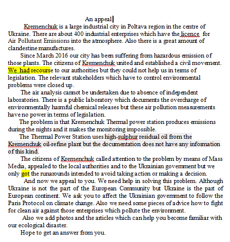 - Жители Кременчуга обратили внимание на проблему с помощью средств массовой информации, обратились к местным властям и правительству Украины, но мы только получили отписки, предназначенные, чтобы избежать принятия мер, - говориться в письме. - Несмотря на то, что Украина не является частью Европейского сообщества, Украина – это часть европейского континента. Мы просим вас повлиять на украинское правительство. Кроме того, нам нужно несколько советов, как бороться за чистый воздух против тех предприятий, которые загрязняют окружающую среду.