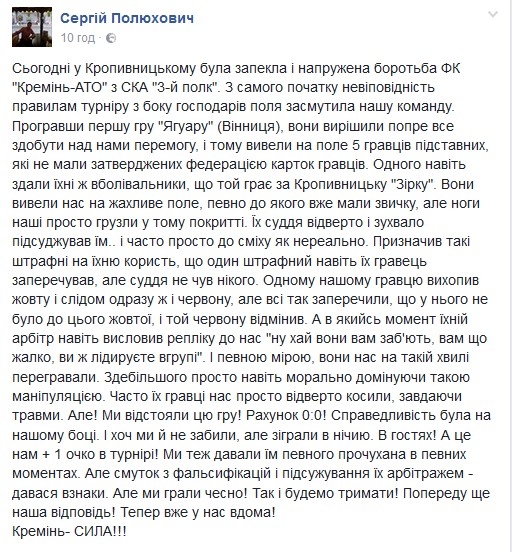 На такій хвилі «3-й полк» і перегравав наших футболістів, пресингуючи більшою мірою морально. Але граючи чесно, наші гравці відстояли гру, хоч і з нічийним рахунком. Нічия на виїзді додала «Кремінь-АТО» 1 очко в турнірній таблиці.