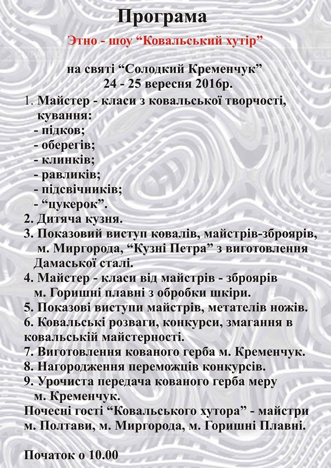 Етно-шоу «Ковальській хутір» представлятиме Кременчуцька спілка ковалів Полтавщини за участю майстрів з Миргорода, Полтави, Горішніх Плавнів та Кременчука у рамках фестивалю «Солодкий Кременчук». Програмою заходів передбачено проведення майстер-класів, дитяча кузня, ковальські розваги, показові виступи майстрів, майстер-класи ножарів, майстер-класи з обробки шкіри та зброї, кування герба міста Кременчука.