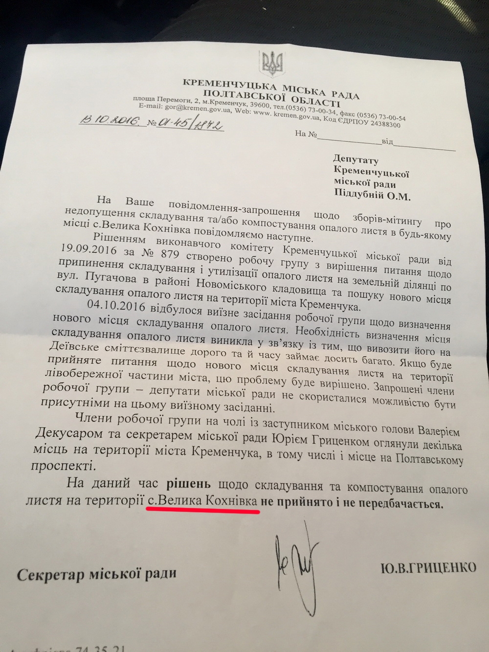 Жители Большой Кохновки отстояли свои интересы – горсовет дал письменный ответ, что свалки опавшей листвы на пустыре около их домов не будет. Соответствующий документ депутат Оксана Пиддубная 22 октября показала собравшимся жителям (Большая Кохновка – это ее округ). Также, на собрание она пригласила и чиновников, которые так и не пришли. При этом депутат заметила, что, если бы свалку все-таки решили делать, то следующий шаг – митинг во время октябрьской сессии горсовета.