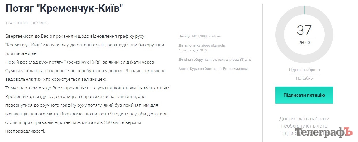 Тому звертаємося до Вас з проханням - не ускладнювати життя мешканцям Кременчука, які їдуть до столиці за справами чи на навчання, але повернутися до зручного графіку руху потягу, який був прийнятним для мешканців нашого міста. Вважаємо, що витрата 9 годин часу, аби дістатися столиці при справжній відстані між містами в 330 км., є верхом несправедливості.