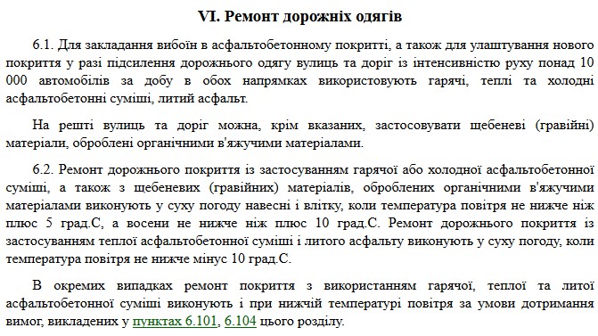 Раздел VI (ремонт дорожных покрытий), пункт 6.2 говорит о том, что ремонт нужно делать в сухую погоду весной и летом при температуре не ниже +5°С и осенью – не ниже +10°С…