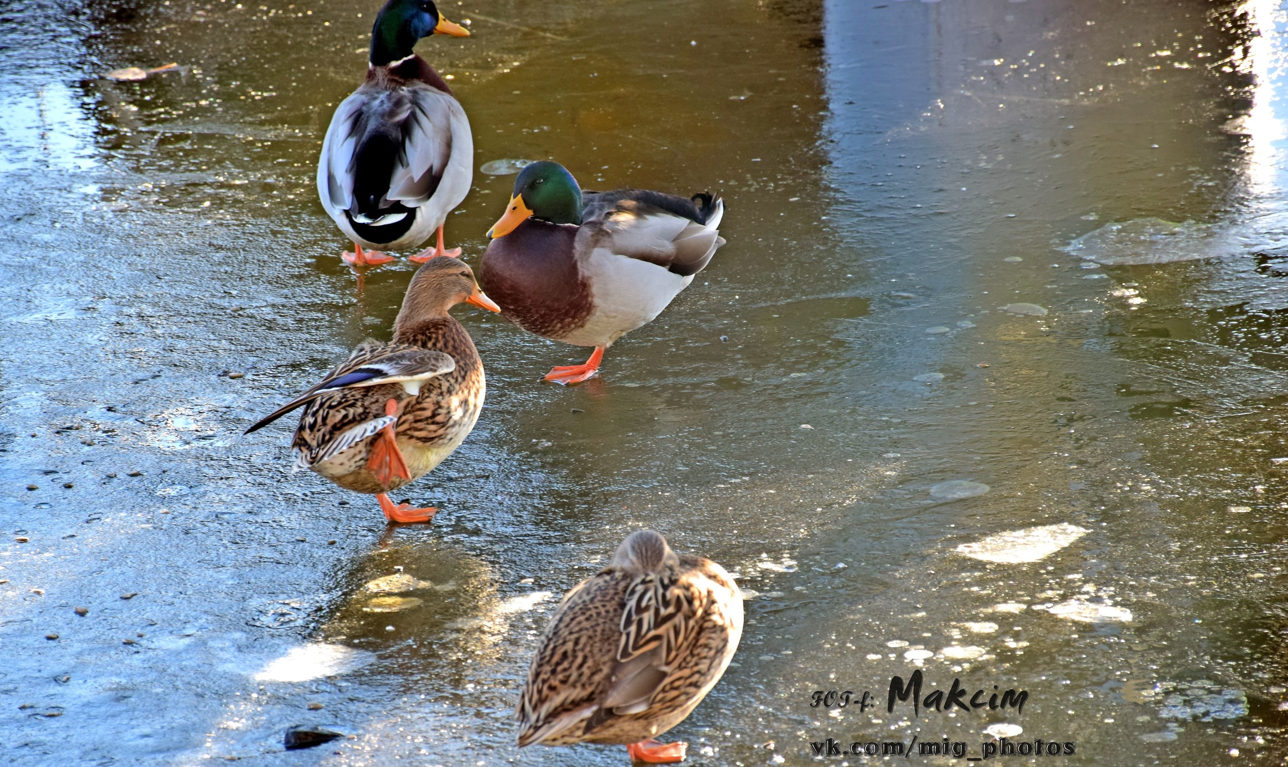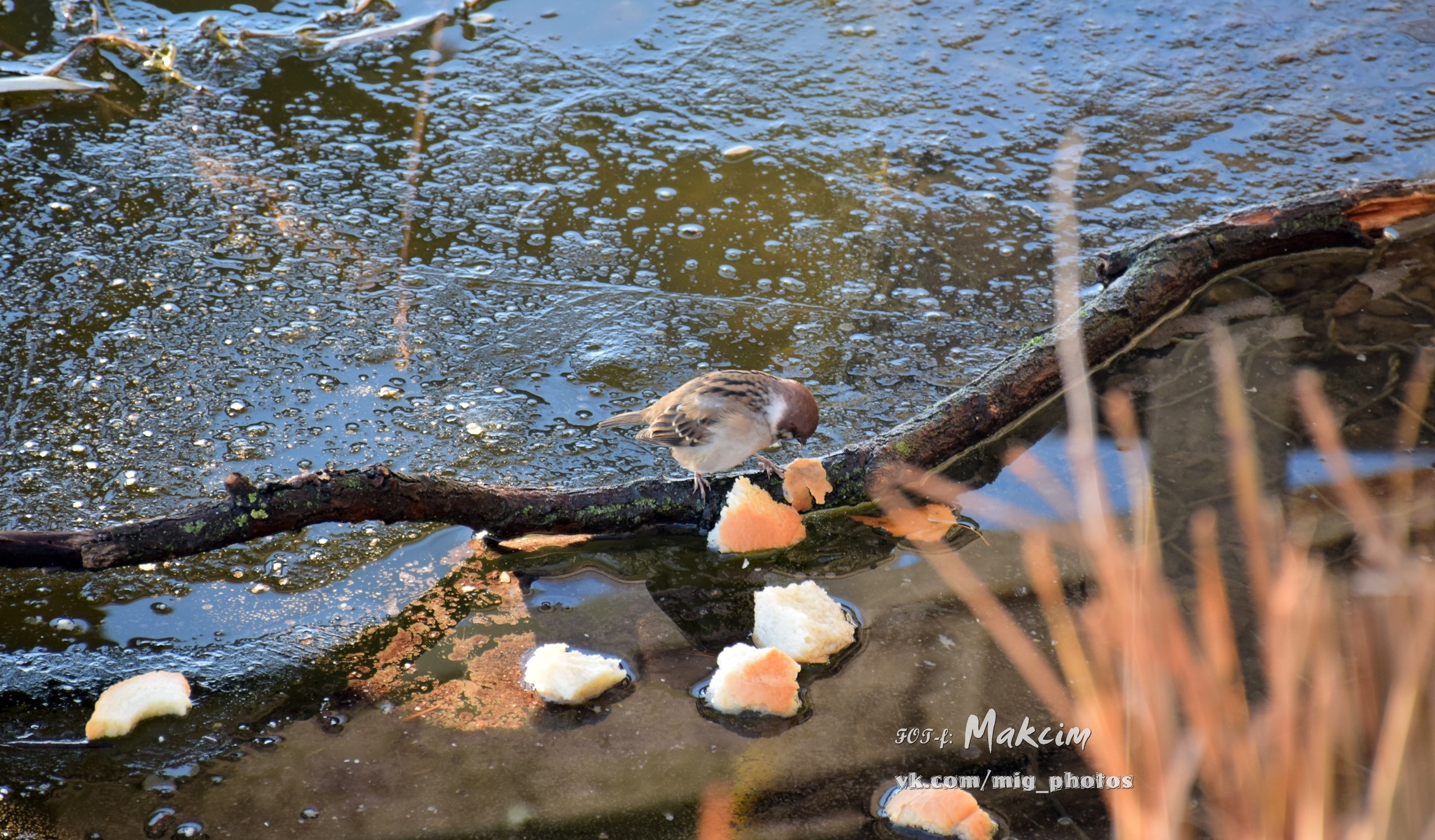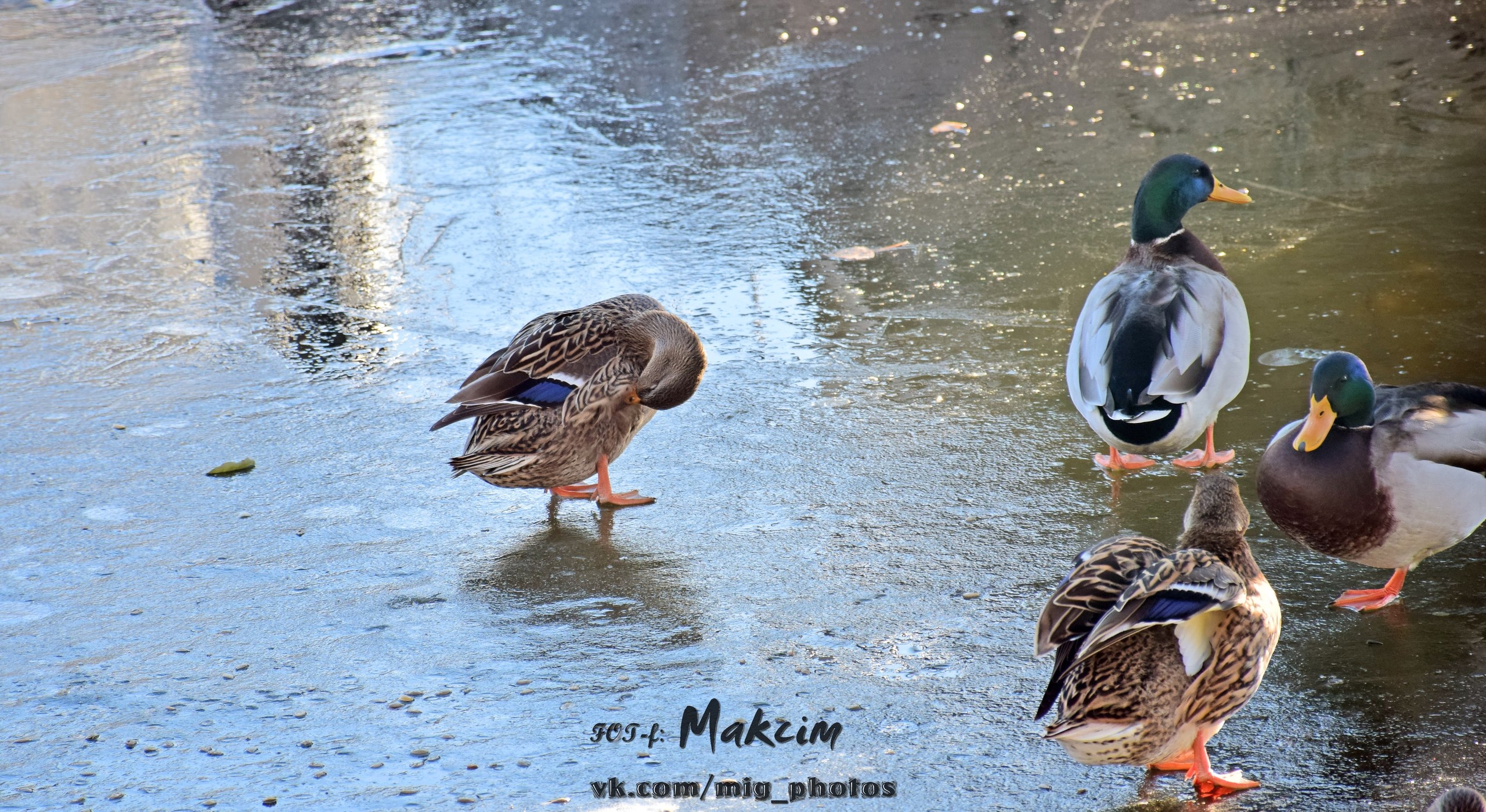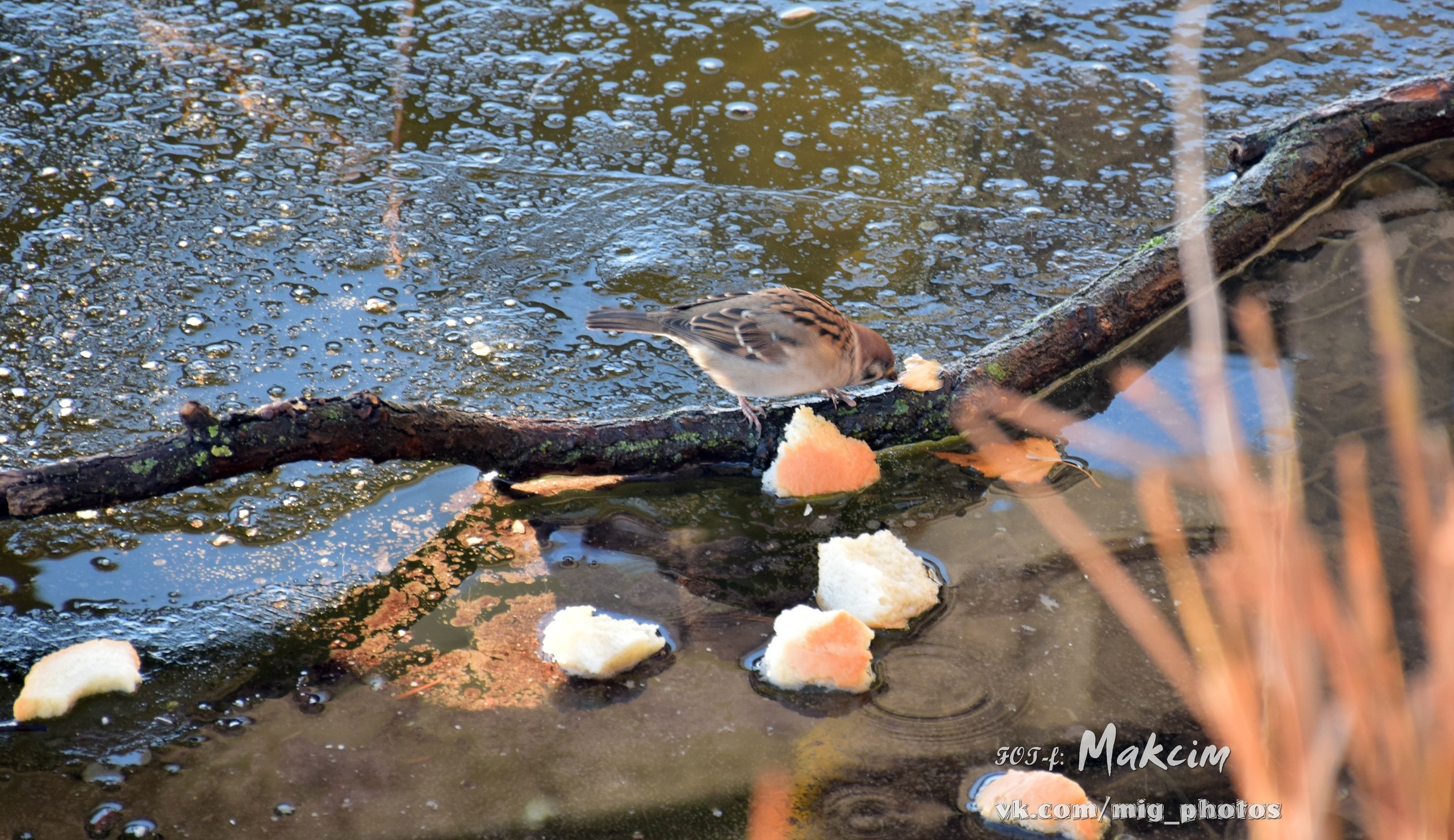 Озеро у берегов уже покрылось коркой льда, и утки забавно по нему гуляют. Также в объектив фотографа попал воробей и красноухая черепаха, которая в наших водоёмах не водится (обитает в Северной Америке, Австралии, Испании, ЮАР).