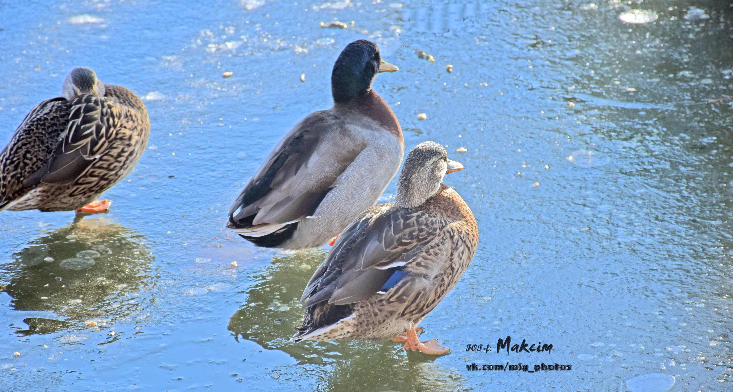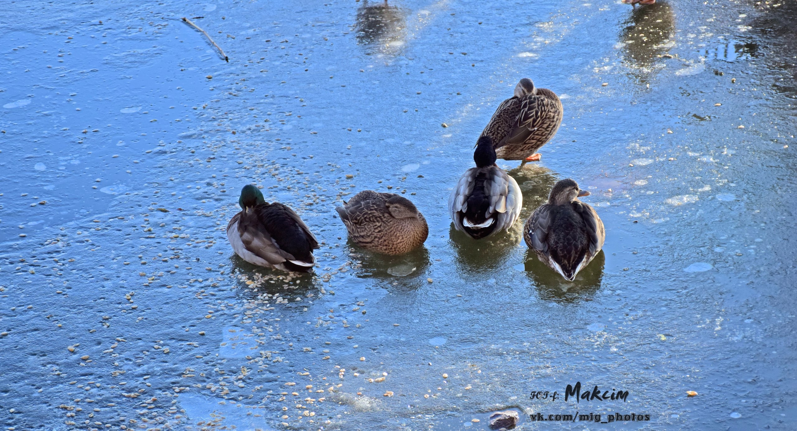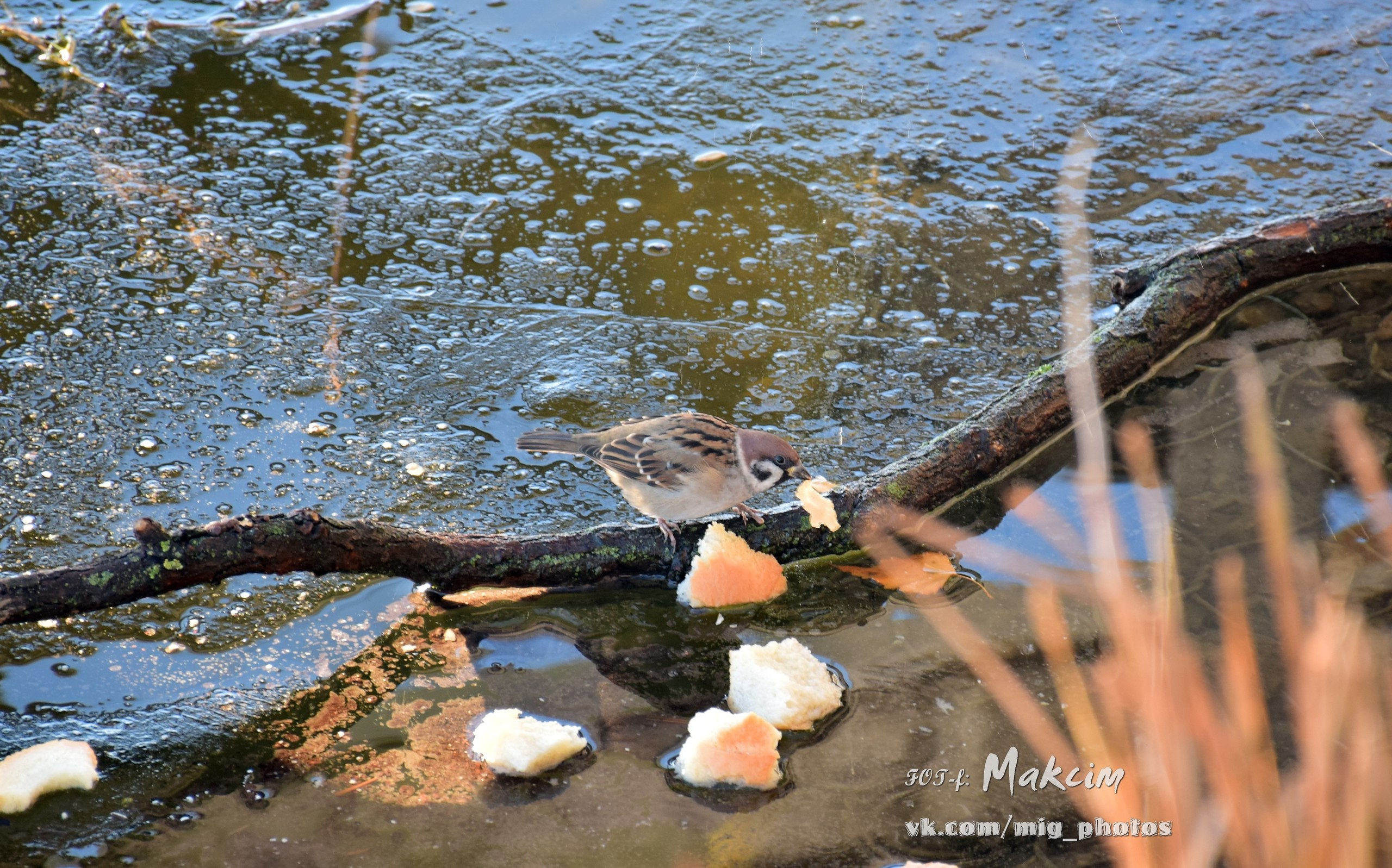Озеро у берегов уже покрылось коркой льда, и утки забавно по нему гуляют. Также в объектив фотографа попал воробей и красноухая черепаха, которая в наших водоёмах не водится (обитает в Северной Америке, Австралии, Испании, ЮАР).