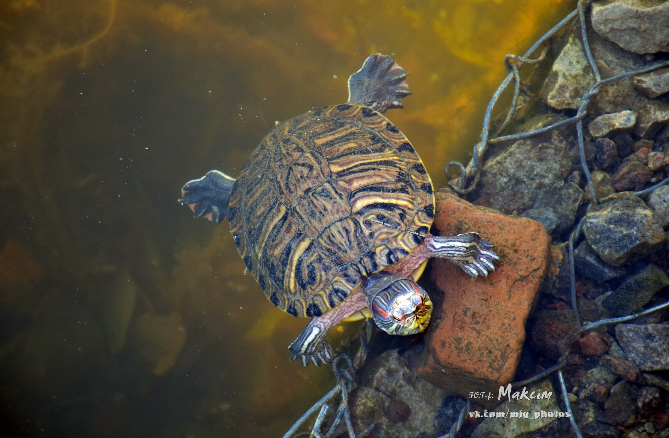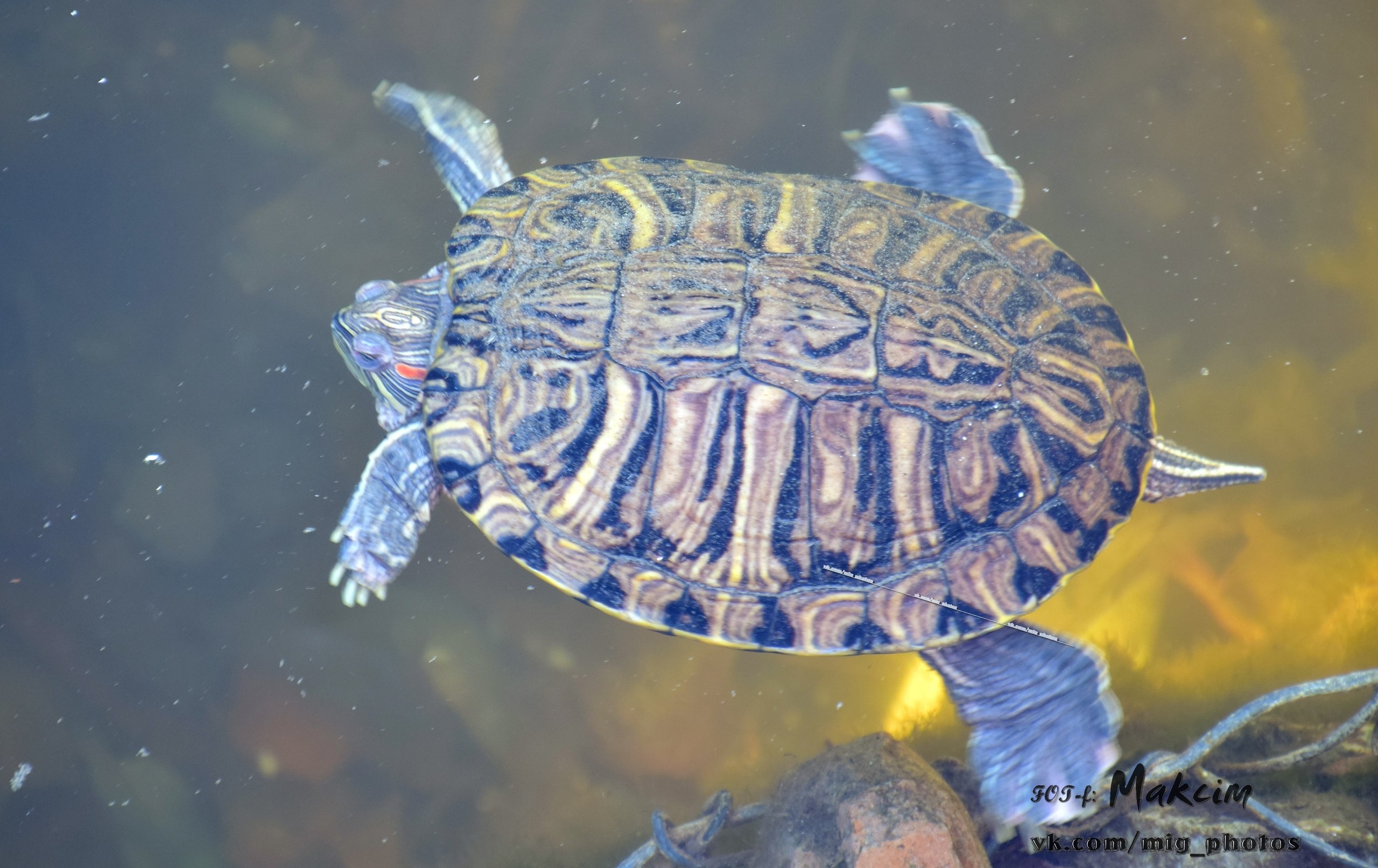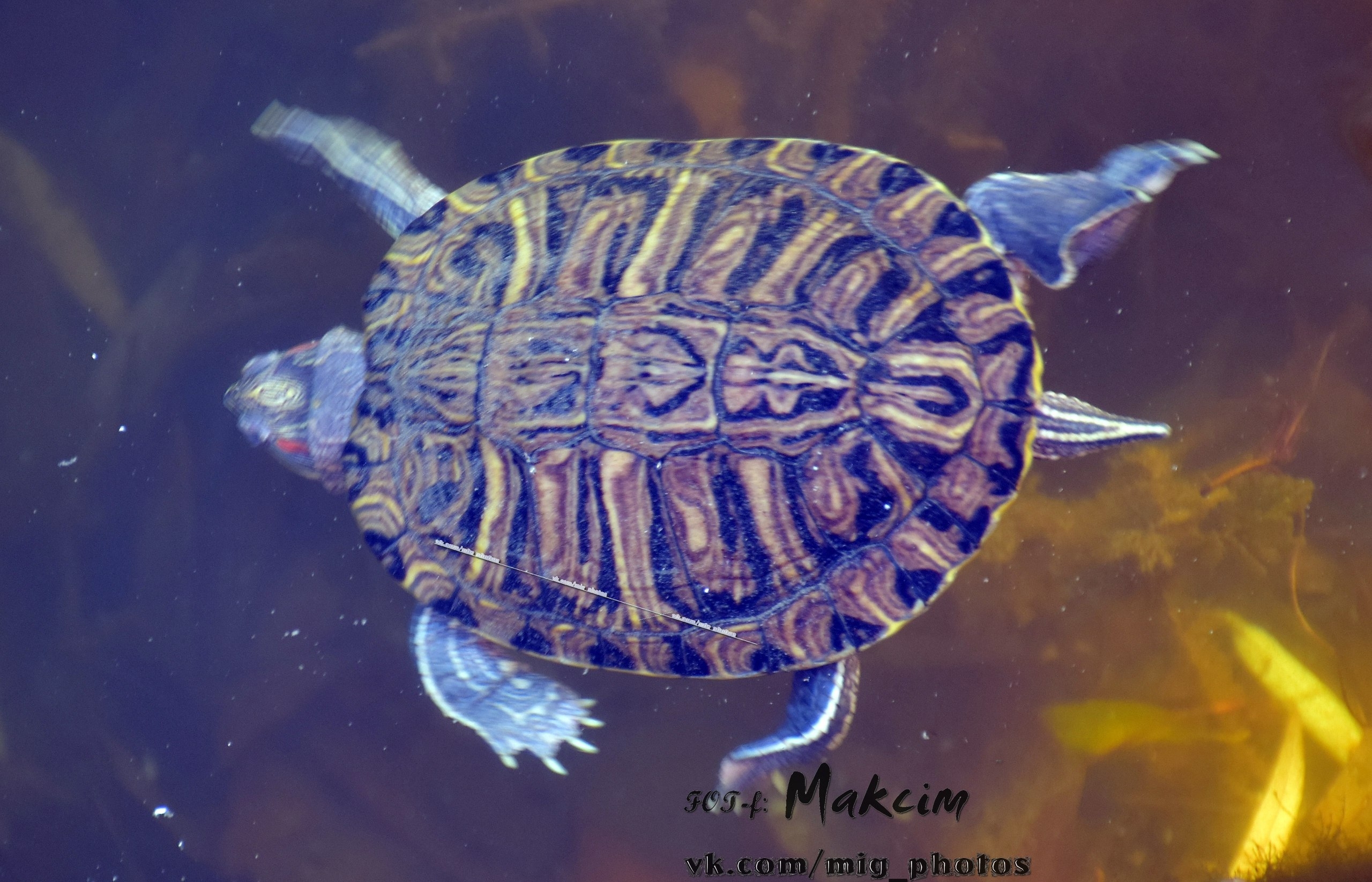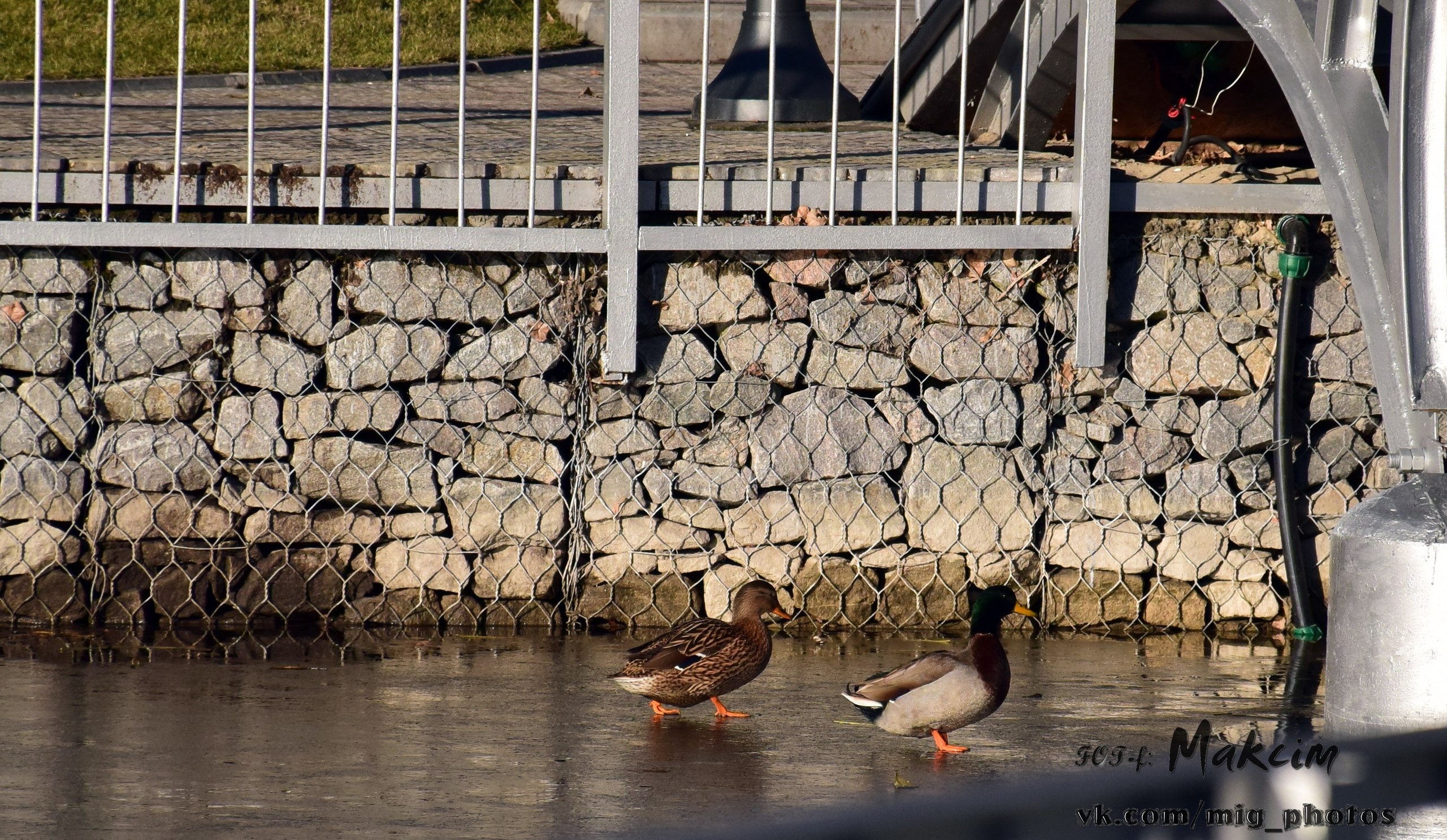 Озеро у берегов уже покрылось коркой льда, и утки забавно по нему гуляют. Также в объектив фотографа попал воробей и красноухая черепаха, которая в наших водоёмах не водится (обитает в Северной Америке, Австралии, Испании, ЮАР).